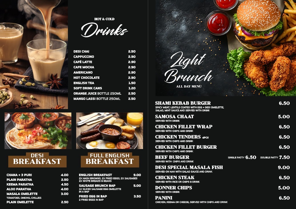 The menu at Haniya desi cafe offers a variety of dishes inspired by South Asian cuisine alongside popular beverages and light meals. It is well-suited for breakfast, casual dining, and quick orders throughout the day.